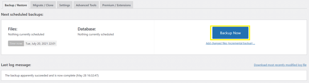 您可以按照与 Wordfence 相同的流程安装和激活它。然后,导航到 “Settings“>”UpdraftPlus Backups“,单击 “Backup Now“: