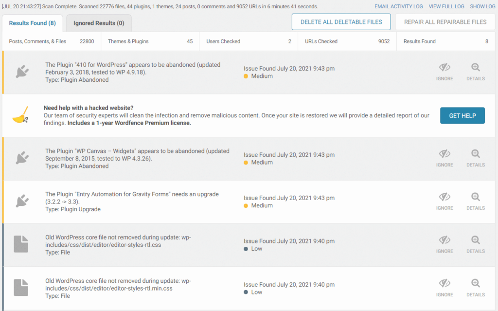 该日志显示所有发现的安全问题列表。它会根据问题的严重程度将其标记为高、中或低优先级。标记为 “WordPress 核心中的未知文件” 的结果表明可能存在恶意软件。