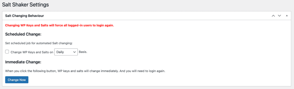 在这里,您可以设置定期更改安全密钥和 Salt 的计划。您也可以点击 “Change Now” 立即更新值。