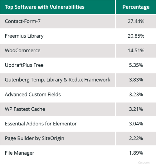 同样,在 Sucuri 的 2022 年报告中,仅 3 个插件就占了他们所查看的被黑网站的 60%以上。