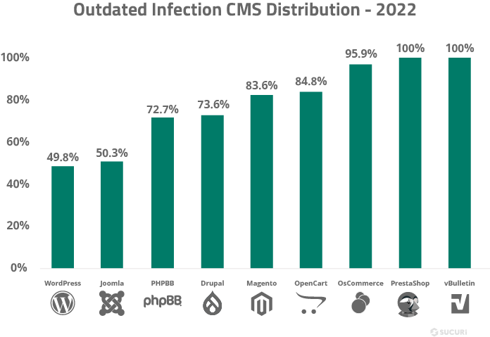 以下是 Sucuri 2022 年被黑网站报告中一个不足为奇的相关数据。在 Sucuri 查看的所有被黑 WordPress 网站中,49.8% 在事件发生时运行的是过时的 WordPress 核心软件。