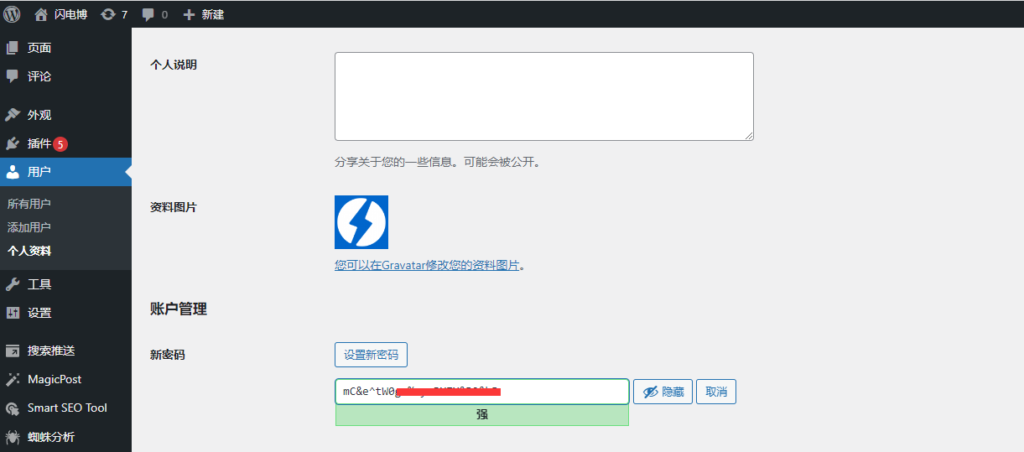 您可以通过转到“用户”>“所有用户”或直接“用户”>“个人资料”来更新WordPress中的密码和电子邮件。向下滚动并在联系信息下找到电子邮件,在帐户管理下找到新密码。