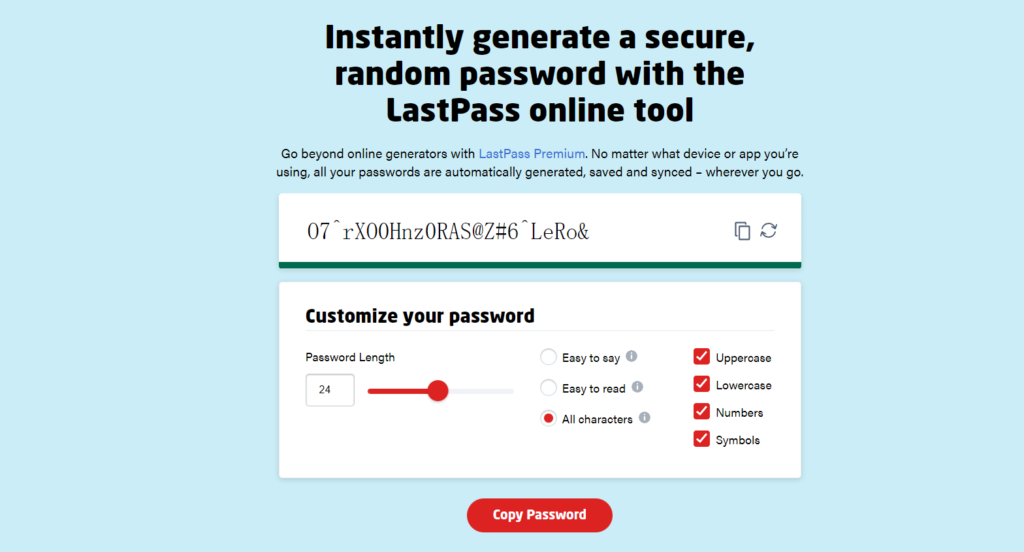 在最好的情况下,您的密码将是一长串乱七八糟的随机字符。我们强烈建议您使用密码管理器。使用像1Password或LastPass这样的网站来生成一个安全的、不可猜测的密码。