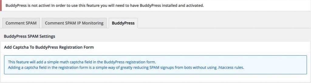 防止垃圾邮件的最后一个选项是在BuddyPress注册表单上添加验证码。如果您不使用BuddyPress,则插件将显示消息,此选项对您没有用处。如果您使用的是BuddyPress,则启用此选项将在注册表单中添加数学验证码并减少垃圾邮件注册。