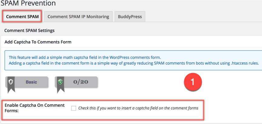 第一个选项是在您网站的评论表单上启用验证码。在评论表单上启用验证码将在安全等级中增加20分,插件将自动添加验证码,无需任何额外的插件或 .htaccess 条目。