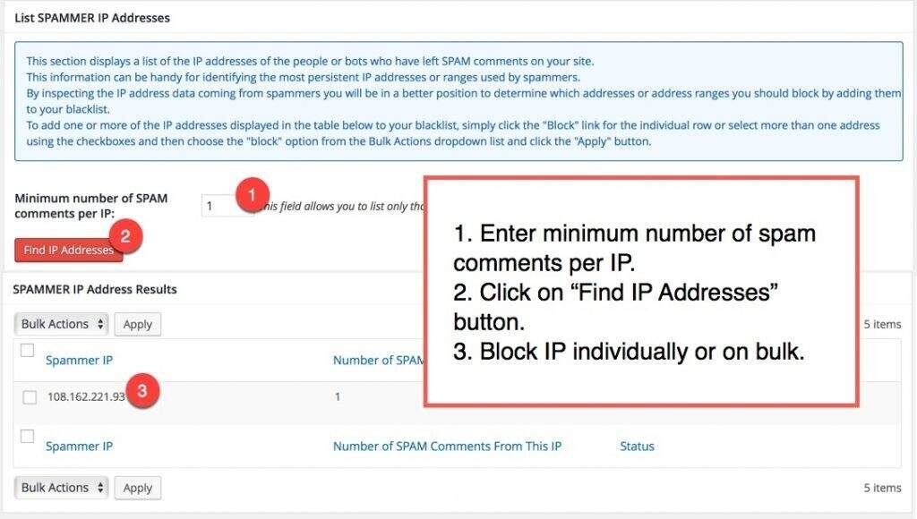 如果您不想自动阻止IP并想手动处理垃圾邮件发送者IP,请输入“Minimum number of spam comments per IP”。例如,如果您输入2并单击“Find IP Addresses”按钮,则将列出收到两条或更多垃圾评论的所有IP。