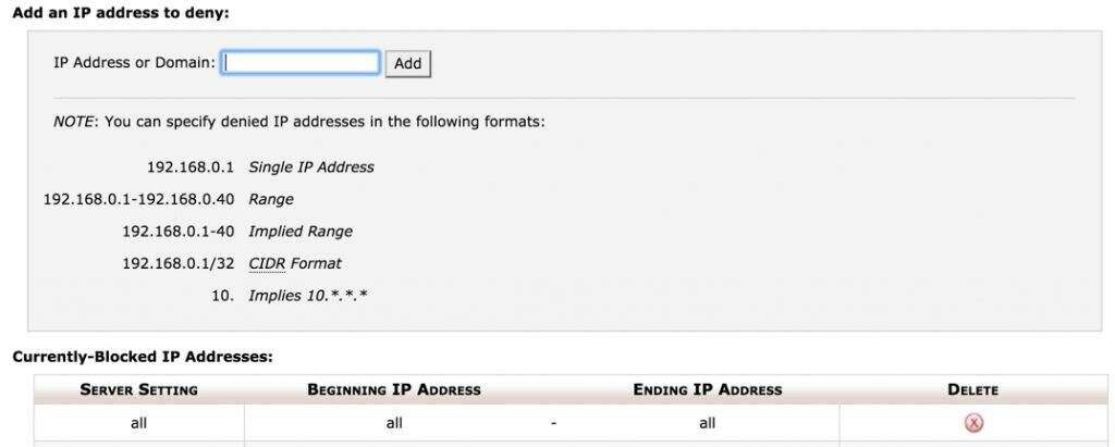 - 与cPanel类似,输入个人IP地址或范围并拦截访问。