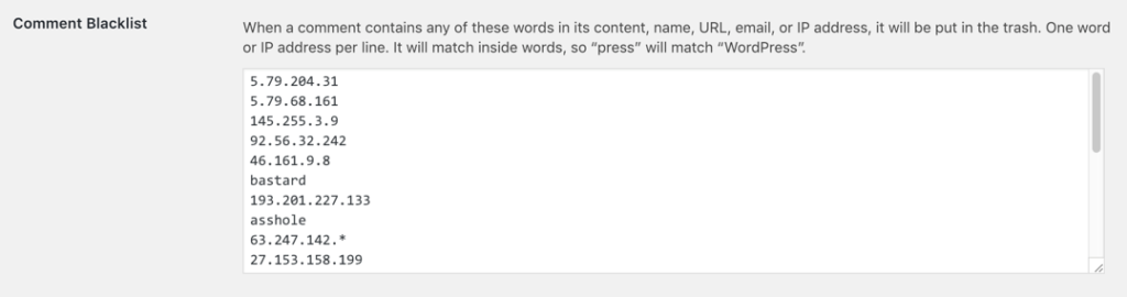 这将拦截用户从指定的IP访问“comments.php”文件。您还可以屏蔽一些不好的词、名称、URL和电子邮件,这样人们就无法在评论中使用它们。