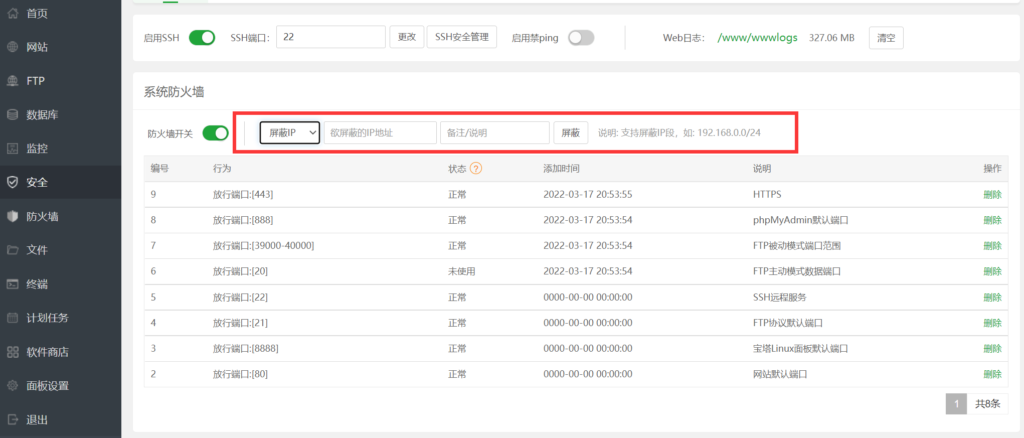 如果您使用宝塔管理服务器,你可以通过宝塔面板后台“安全”,来添加屏蔽IP地址: