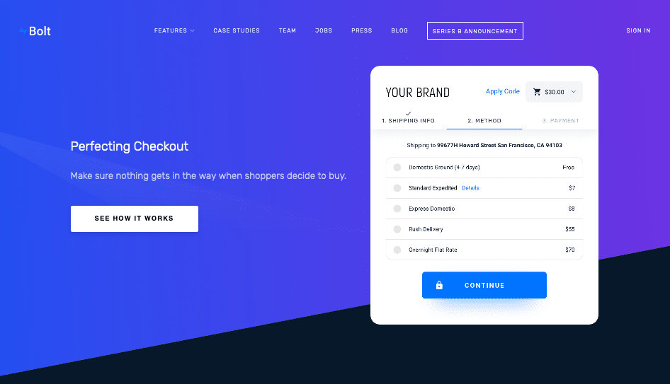 从技术上讲,Bolt与其说是防欺诈解决方案,不如说是一种结账UI解决方案……但是,由于防欺诈内置于其系统中,因此它兼具两者的资格。Bolt是针对欺诈检测和用户体验的优化结账系统,旨在通过可用性增加销售额并减少放弃。
