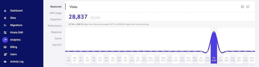 在下面的屏幕截图中,您可以看到在DDoS攻击期间站点收到的请求突然激增。