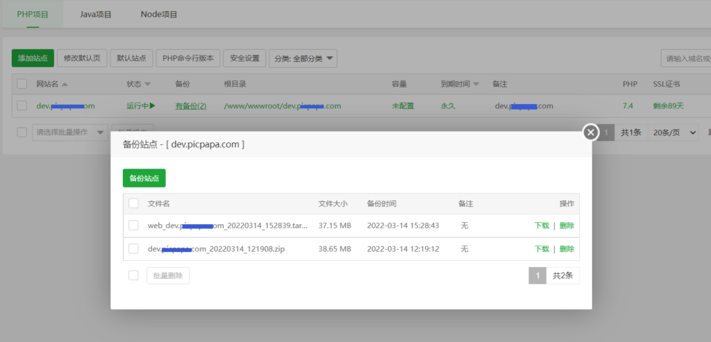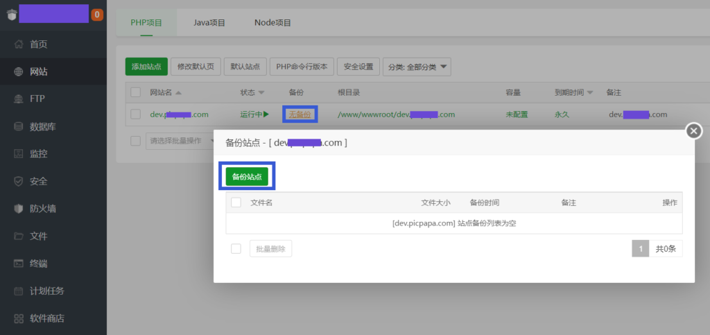 在宝塔面板,您可以设置WordPress备份计划。但是,在进行任何重大更改之前创建手动备份仍然是明智之举。要创建此安全网,请登录您的宝塔仪表盘。然后,单击左侧的“网站”菜单,找到你需要备份的网站对应的备份操作,然后在弹窗中点击“备份站点”。