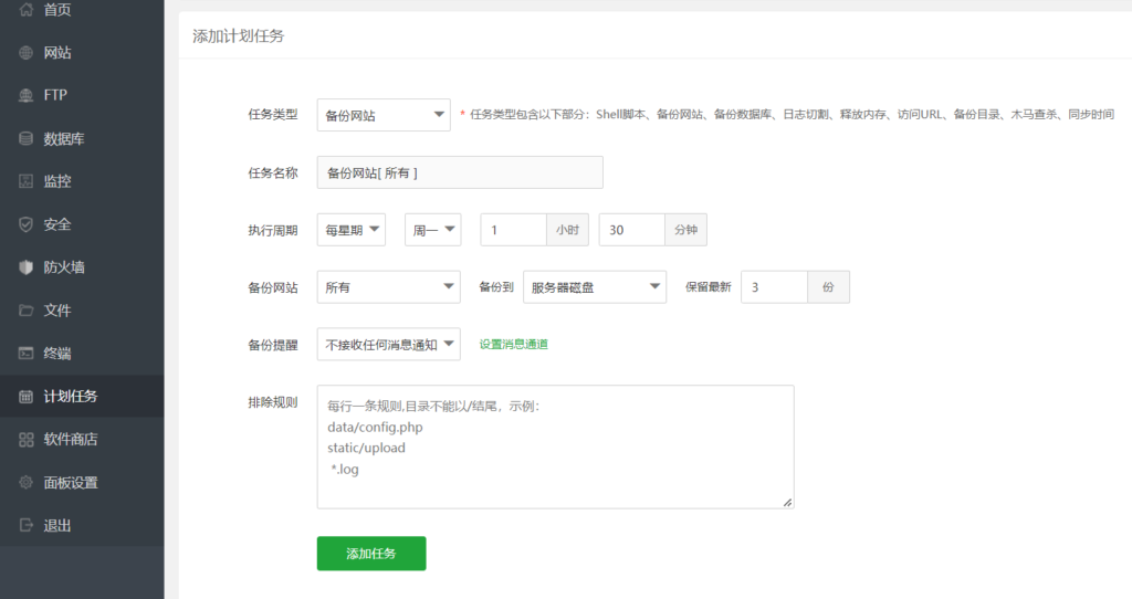 您也可以通过宝塔面板的计划任务,来创建备份网站或者备份数据库任务,可以设置执行周期,对您的网站文件和数据库按周期定期备份,这是一个非常方便的功能。