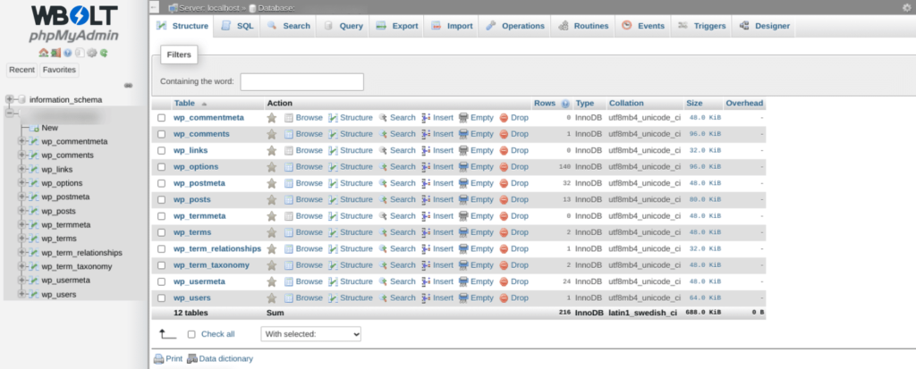 您需要进入您网站对应的数据的phpMyAdmin,它将启动数据库管理器。从左侧菜单中选择您网站的数据库,您应该会看到如下表的列表: