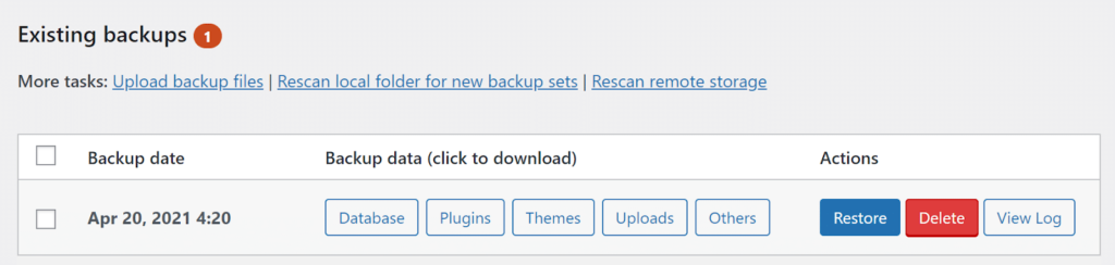 UpdraftPlus使您能够单独下载任何备份文件组件,例如其插件、主题、上传文件甚至数据库。您还可以通过单击相应的按钮来删除或恢复备份。