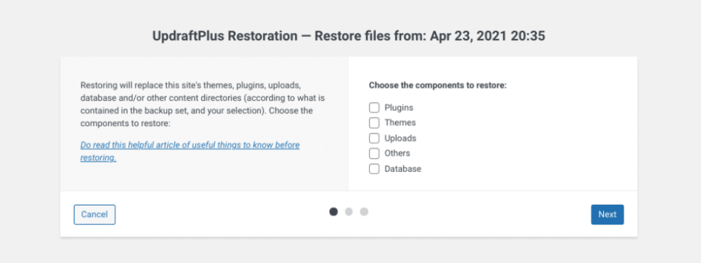 恢复UpdraftPlus备份是一件简单的事情。该插件会询问您要恢复哪些组件,您应该选择所有组件: