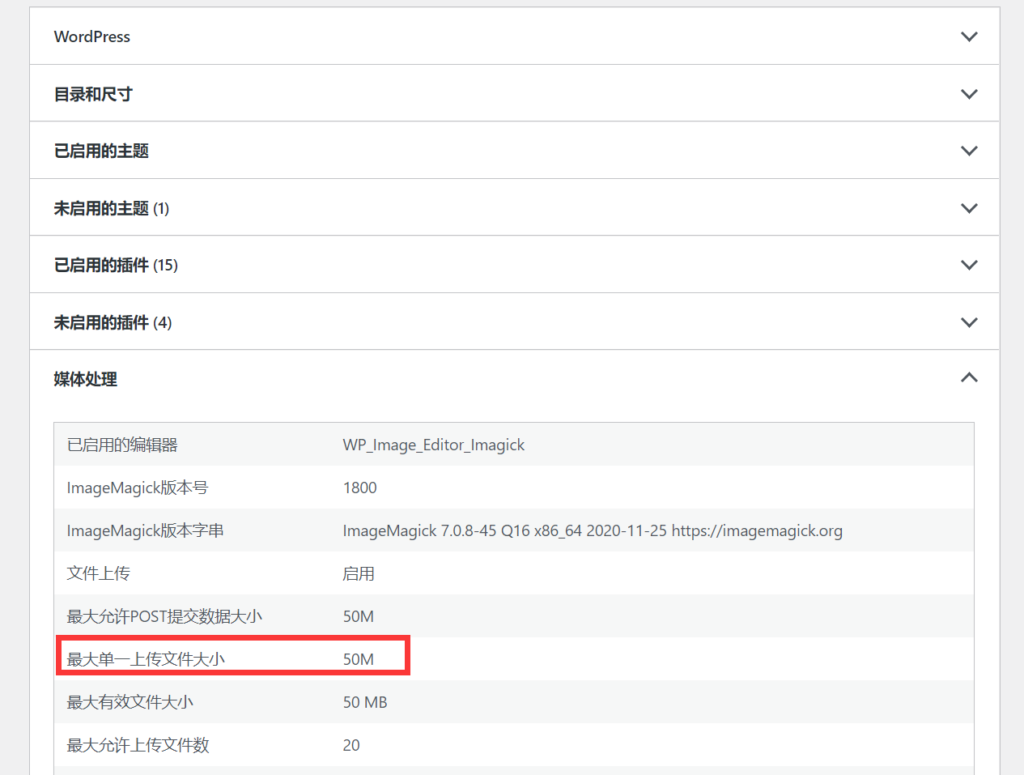 首先,您可以在“媒体处理”下拉列表中找到“最大单一上传文件大小”的值。