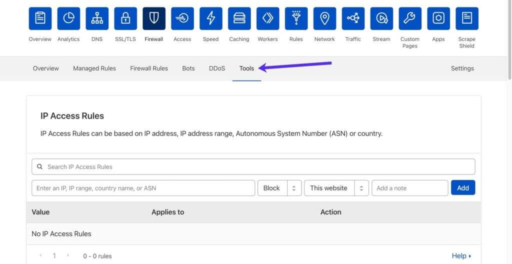 在Cloudflare仪表盘中,导航到Firewall > Tools。