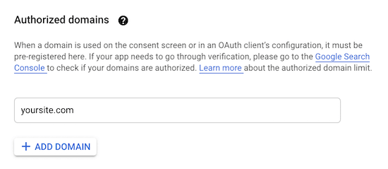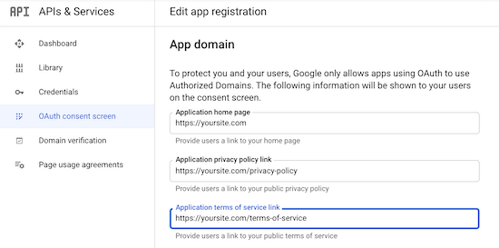 然后,输入您的“App domain”信息。您需要填写所有三个字段。Google需要这些信息来确保您的网站符合在线隐私法规和用户同意。