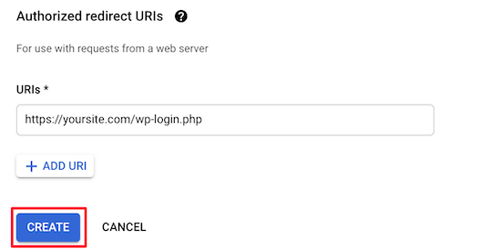 之后,单击“Authorized redirect URLs”部分中的“Add URL”按钮并输入您的登录重定向URL。此URL是您的登录页面的 URL。对于大多数WordPress网站,这将是“yoursite.com/wp-login.php”。