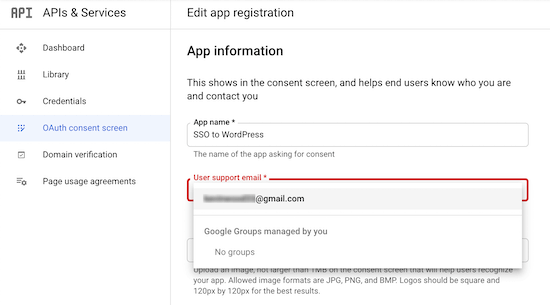 之后,单击“Create”按钮。这会将您带到一个屏幕以输入您的应用程序详细信息。首先,您需要输入您的“App name”并从下拉列表中选择“User support email”。