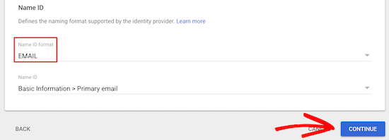 接下来,从“EMAIL”下拉列表中选择“Name ID format”。然后,单击屏幕底部的“Continue”。