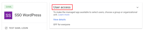 完成后,单击“Finish”按钮。现在,您将返回到刚刚创建的SAML应用程序。选择您的应用程序,然后单击“User access”部分。