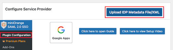 在此屏幕上,确保选择了“Google Apps”并向下滚动到“Configure Service Provider”部分,然后单击“Upload IDP Metadata File/XML”按钮。