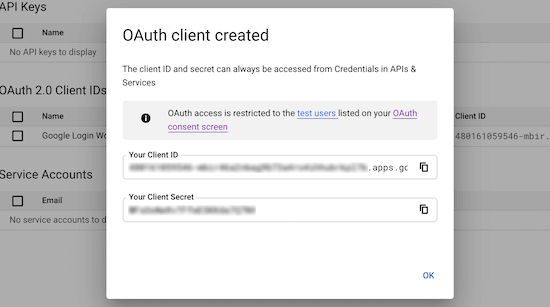 之后,单击“Create”按钮。这会弹出一个包含您的“Client ID”和“Client Secret”的弹出窗口。您需要将这两个复制到您喜欢的文本编辑器中。