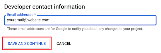 确保您输入的域正确填写协议http://或https://。接下来,在“Developer contact information box”中输入您的电子邮件地址,以便Google在您的项目出现问题时与您取得联系。