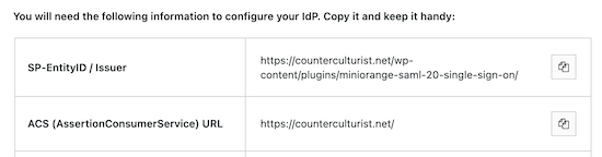然后,向下滚动页面,直到找到列出了“SP-EntityID/Issuer”和“ACS URL”的图表。复制这两个并将它们粘贴到您最喜欢的文本编辑器中。