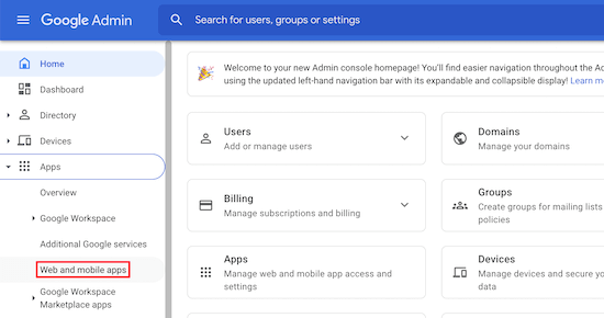 完成此操作后,您需要在新选项卡中打开Google管理控制台。然后,转到左侧导航菜单中的Apps » Web and mobile apps。