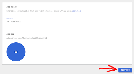 在下一个屏幕上,您需要为您的应用程序命名,并且您可以根据需要上传自定义Logo。然后,单击“Continue”按钮。