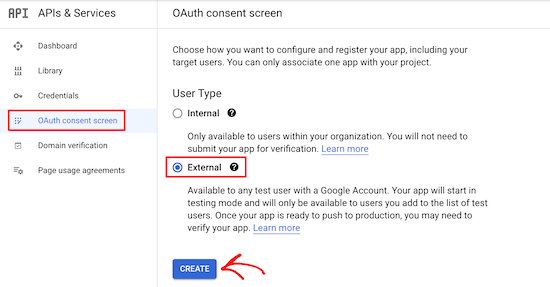 接下来,单击左侧菜单中的“OAuth consent screen”选项。在这里,您有两个选项可供选择。如果您有会员网站或销售在线课程并希望允许您的用户使用Google登录,则“External”选项很有意义。“Internal”选项仅允许您公司内的用户使用Google登录。对于此选项,您需要拥有一个高级Google Workspace帐户,并且您的用户需要被添加为团队成员。