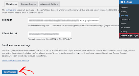现在您需要导航回您的WordPress管理面板并转到Settings » Google Apps Login。在此屏幕上,您将输入从上面复制的“Client ID”和“Client Secret”字符串。