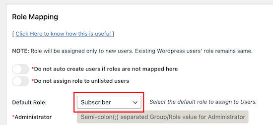 然后,向下滚动到“Role Mapping”部分。您可以在此处更改默认角色,该角色将分配给所有使用SSO登录的非管理员用户。如果尚未选择,请从下拉列表中选择“Subscriber”,然后单击屏幕底部的“Save”按钮。