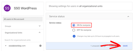 然后,在“Service status”框中,单击“ON for everyone”单选按钮。之后,单击“Save”。