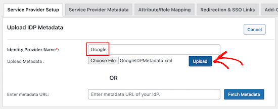 现在,在“Identity Provider Name”框中键入“Google”,然后单击“Choose File”按钮。然后,选择您之前下载的 XML 文件并单击“Upload”按钮。