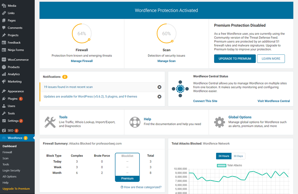 您看到的标准WordFence仪表盘非常有用,它显示在WP管理面板的WordFence – Dashboard下。您可以查看截至该时间点的保护摘要、扫描次数、最近一次扫描中的问题数量等。