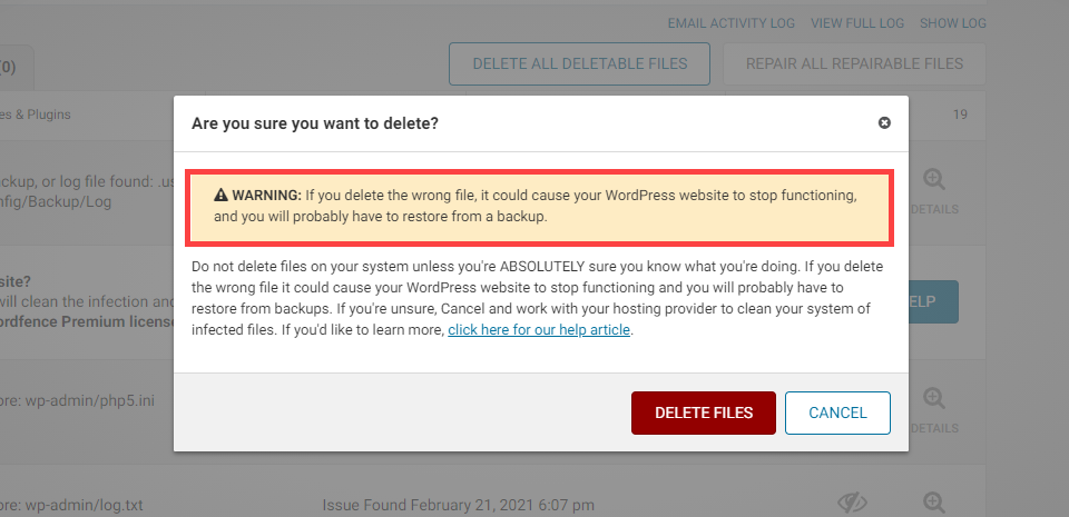 但是,您应该始终在执行此操作之前备份您的WordPress网站,以确保您没有删除任何必要的内容。WordFence甚至会提醒您这样做。