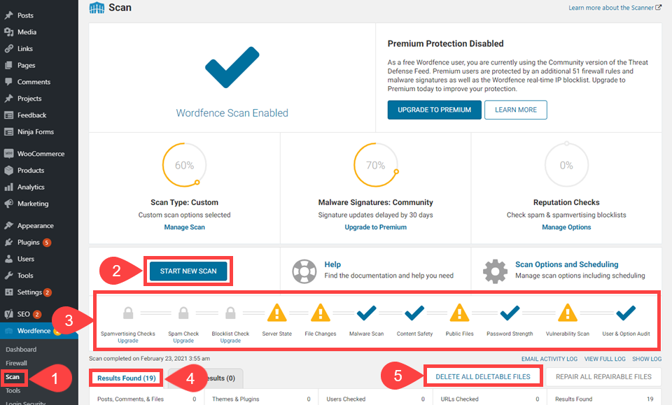 当您按下Start New Scan (2)按钮时,WordFence会按照各种条件的进度条 (3)工作。(我们说进度条是因为它按此顺序检查。)扫描后,您会在Results Found (4) 选项卡中看到详细的结果日志,以及您可以在右侧(5)采取的操作。