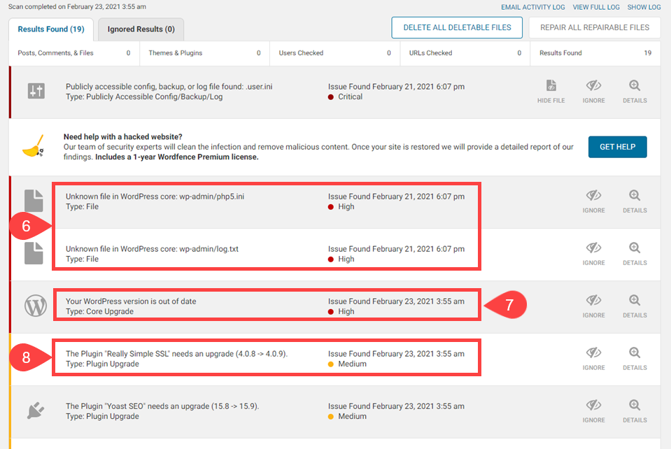 如果您看到带有红点的标记为High Priority (6) 的消息 ,则需要尽快查看。特别是如果您看到它说WordPress core中有一个 未知文件。这是个坏消息。幸运的是,WordFence允许您通过单击按钮Delete All Deletable Files(5)删除所有可删除文件 。