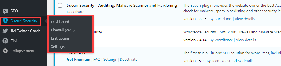 安装 Sucuri 非常简单。前往WordPress.org插件库上的Sucuri页面并下载它。或者直接转到WP管理面板 插件 –安装插件。启用后,会出现一个名为Sucuri Security的新菜单选项, 并带有弹出菜单。