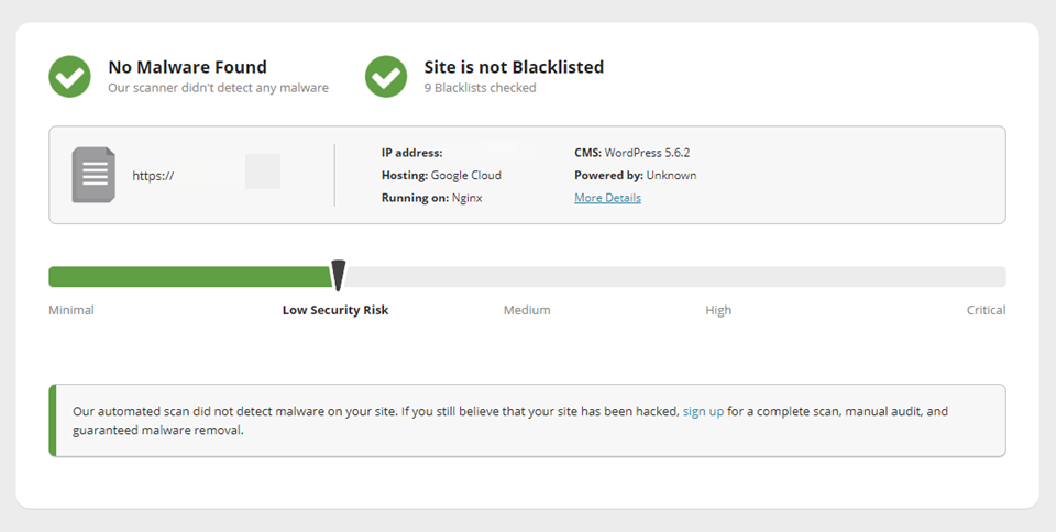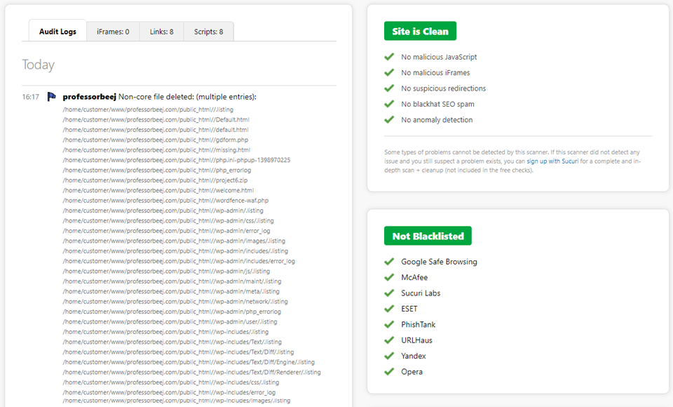 您应该会看到一个干净且安全的站点以及哪些文件已被删除。您还将看到专门针对Sucuri扫描的内容,并且您的网站没有被任何服务列入黑名单,因为它已被入侵。这是最好的情况。