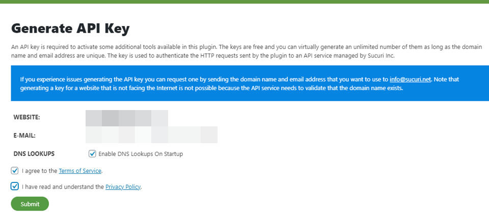 然后,您需要查看并确认您的信息,以便Sucuri生成密钥。