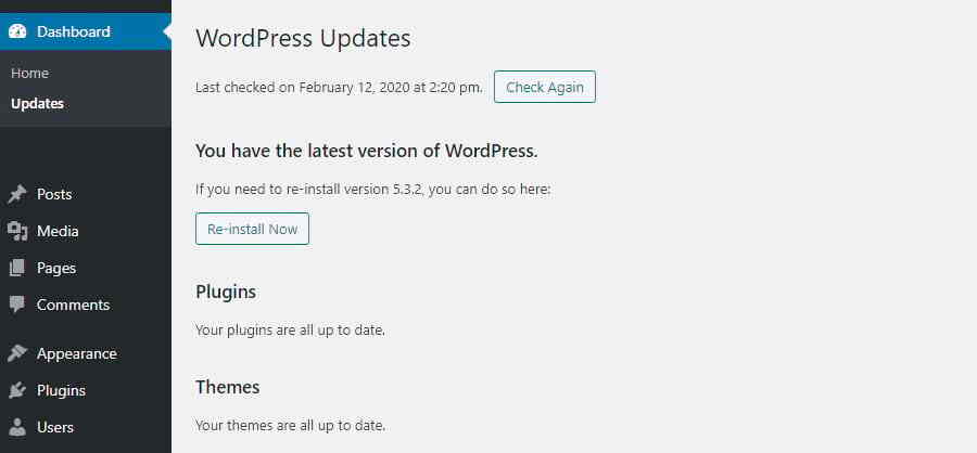 您还可以转到WordPress后台的 仪表盘> 更新,如果您运行的是旧版本,则将提示您进行更新,或者通知您已经安装了最新版本的WordPress。