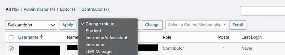 要为用户分配 Instructor 角色,请进入 WordPress 面板,选择用户>所有用户。勾选要为其分配角色的用户名旁边的复选框。