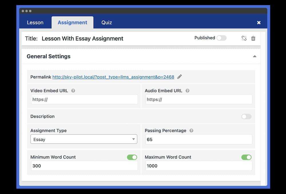 选择提交类型,如文件上传或文本回复,并设置截止日期。在下面的示例中,你可以看到一个列出了字数规范的作文作业。(注意:您需要高级 LifterLMS 作业模块才能使用此功能)。