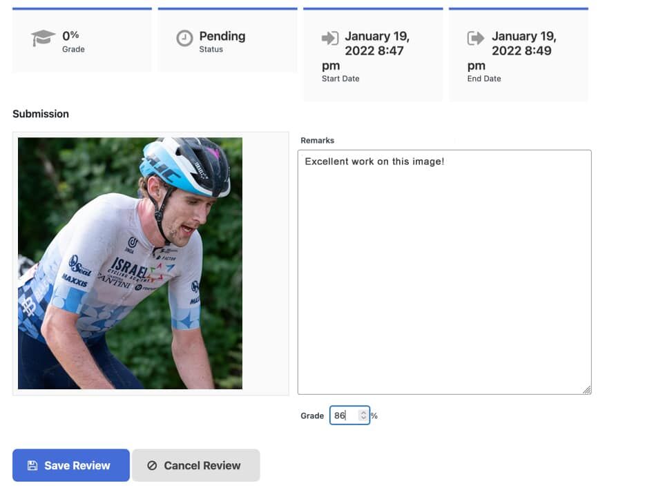 查看提交的作业时,单击“Start a Review”开始评估。审阅作业后,在 Remarks 栏中给作业评分并提供反馈。