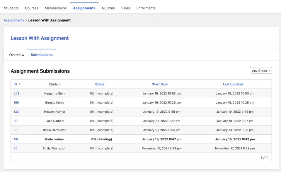 转到 LifterLMS > Reporting ,然后单击“Assignments”选项卡查看作业。选择作业,查看学生提交的作业列表。